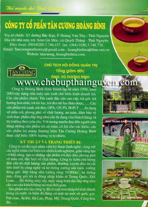 Địa chỉ công ty chè Tân Cương Hoàng Bình : Xóm Gò Móc, Xã Quyết Thắng, Thành Phố Thái Nguyên, Tỉnh Thái Nguyên, Việt Nam