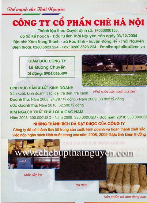– Quy mô nhà máy: Công ty chè Tân Cương Hoàng Bình, Công Ty Chè Hà Nội (chè búp Thái Nguyên đá giải Gia Đình)